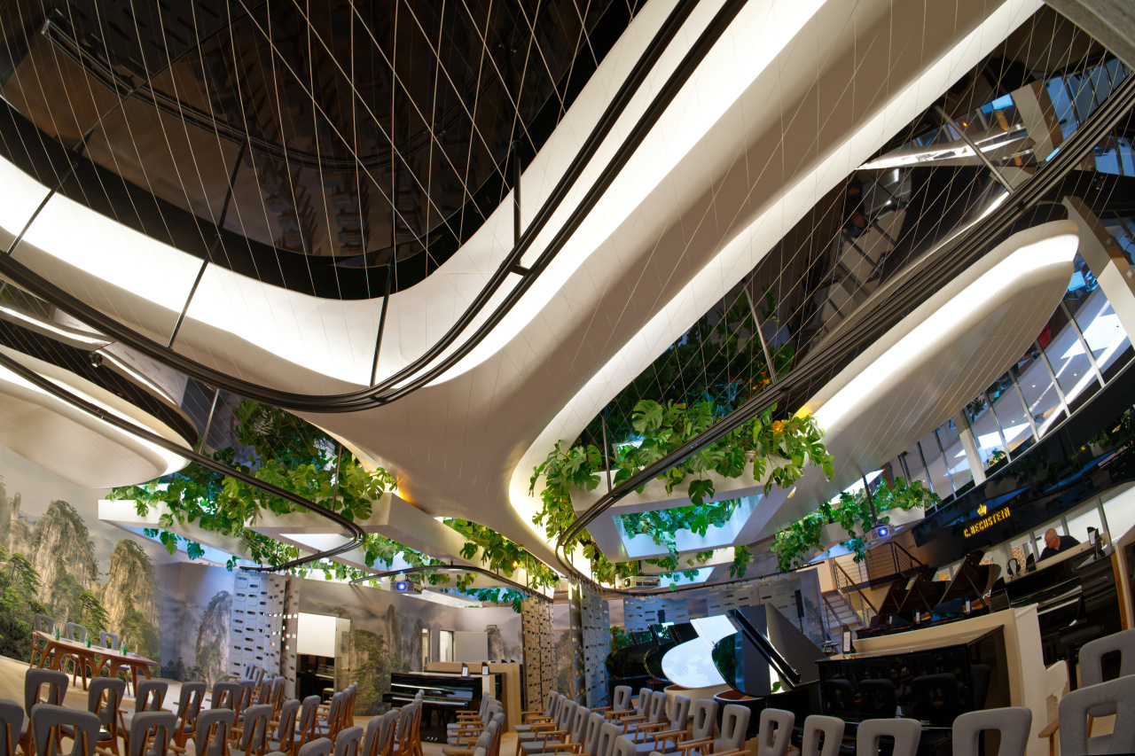 The façade of the flagship store – an imposing glass arch – is reminiscent of a concert grand piano. The three-dimensional ceiling structure inside the store is another highlight: It is inspired by the cast frame, the load-bearing component in the piano in which the strings are clamped and which is responsible for the piano’s sound. The impression of the grand piano strings made of stainless steel cable on the top conveys the feeling of being inside the instrument. Piano lacquer is furthermore used to create mirror surfaces in the room.