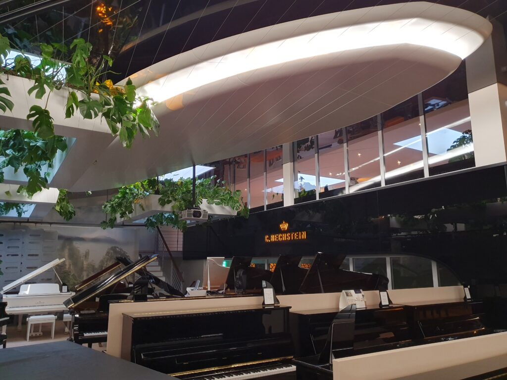 The C. Bechstein flagship store features grand and upright pianos staged under black mirrored ceilings and planted skylights in front of an imposing mountain landscape.