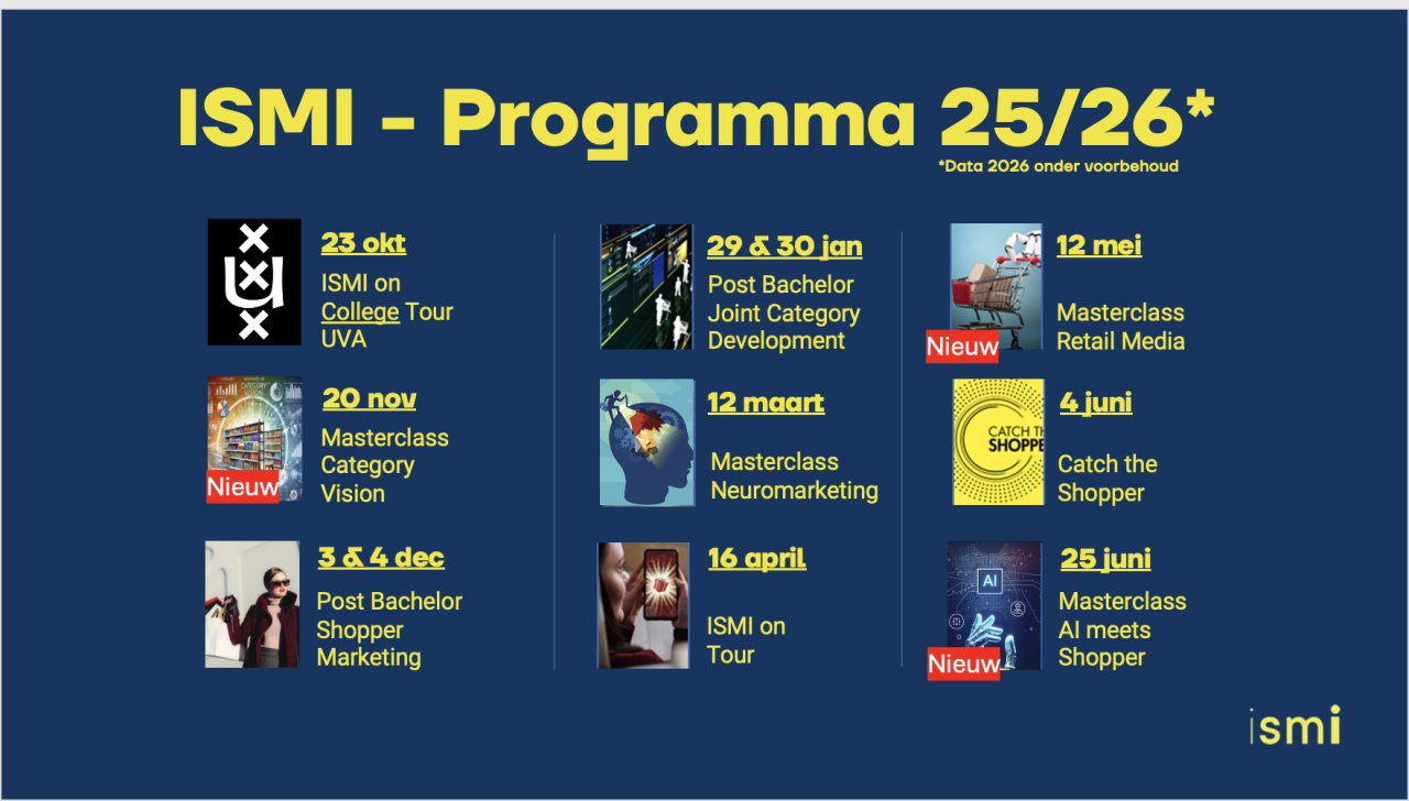 Als kennisinstituut bieden we onze leden een uniek pakket aan activiteiten om up-to-date te blijven binnen het vakgebied. Het ISMI lidmaatschap is gekoppeld aan je organisatie en niet aan personen. Binnen het lidmaatschap is er altijd ruimte voor 2 deelnemers per bedrijf. Dat betekent dat ook je collega’s (afwisselend) al onze ISMI opleidingen en/of events kunnen bezoeken. Wil je bijvoorbeeld zelf met een collega naar de Tweedaagse Postbachelor Shopper Marketing en je andere collega's naar de Tweedaagse Postbachelor Joint Category Development? Geen probleem. Dat valt allemaal binnen het standaard lidmaatschap van €2150,-. Geen extra kosten dus!