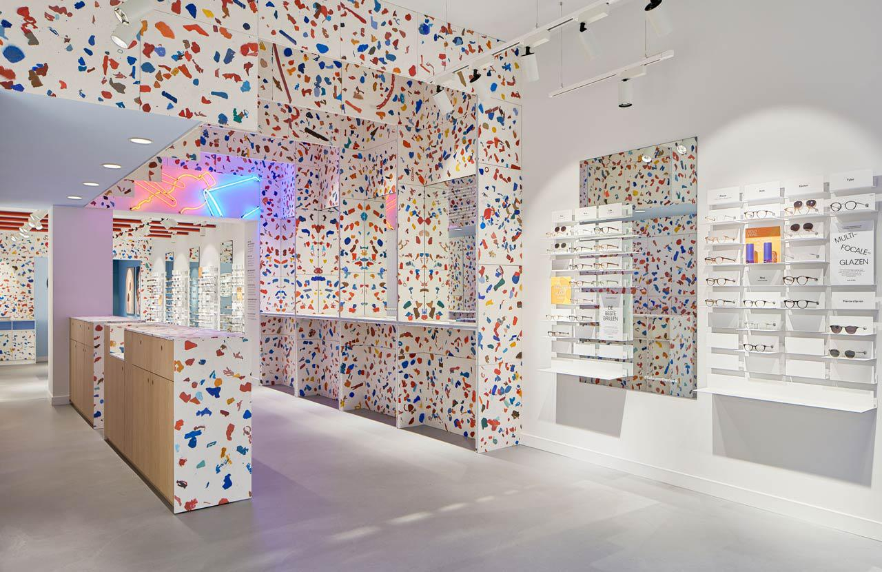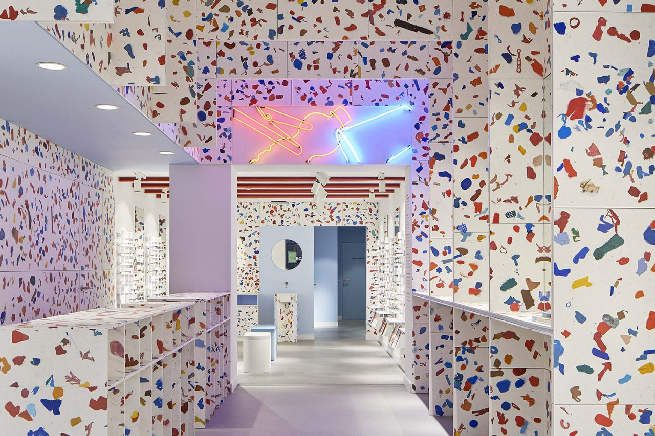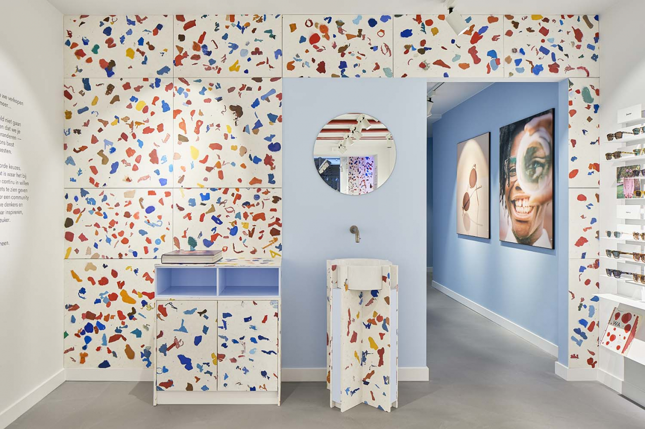 Inside the newest Ace & Tate shop in Antwerp, Belgium, colorful, chunky terrazzo immerses visitors in a wonderful world of waste. Made from recycled local plastic, the material selection is part of the Dutch eyewear brand’s goal to become more sustainable.
