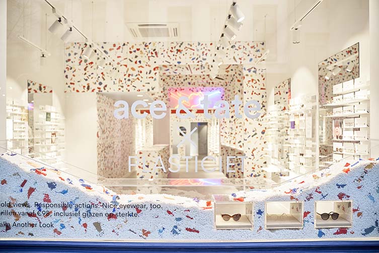 “The pattern and beams’ repetition combined with mirrors allow the viewers to indulge completely in the recycled world,” says Joost Dingemans, co-founder of Plasticiet, the company behind the material and the designers who worked closely with Ace & Tate’s team.