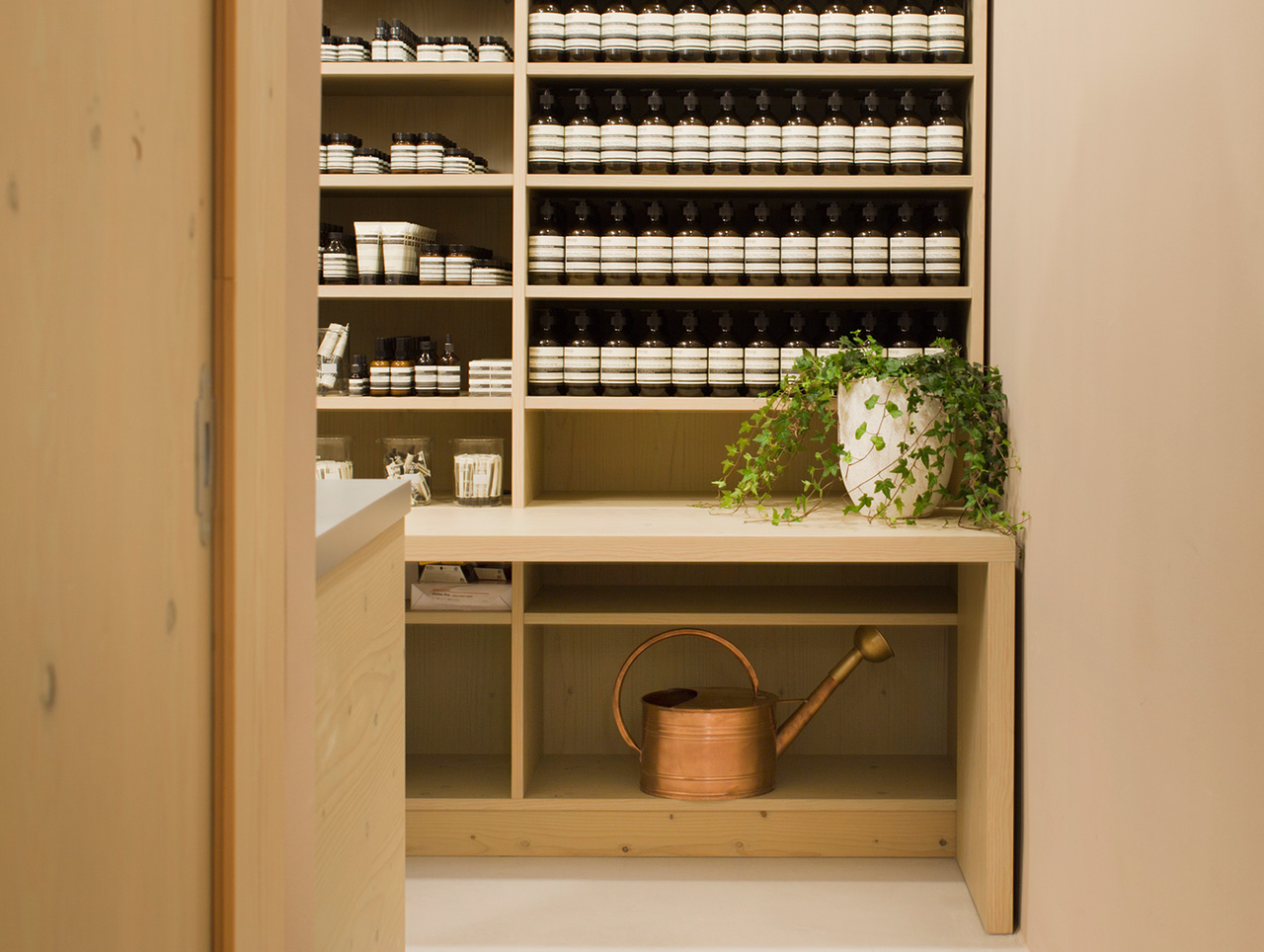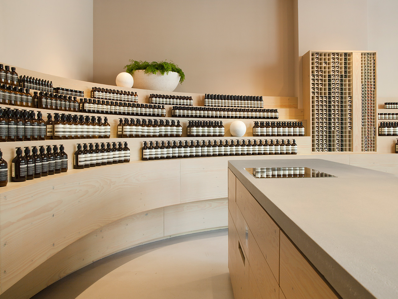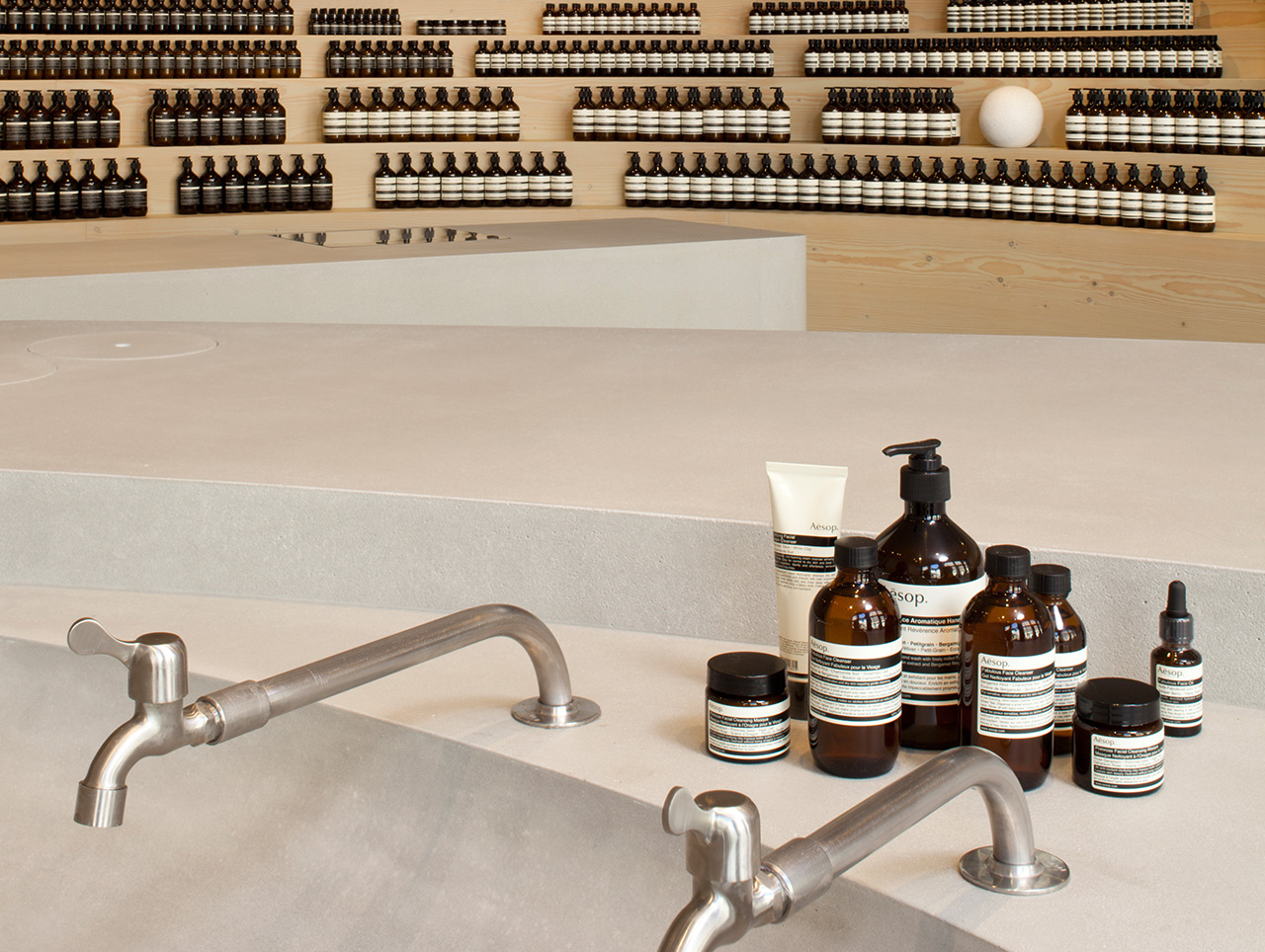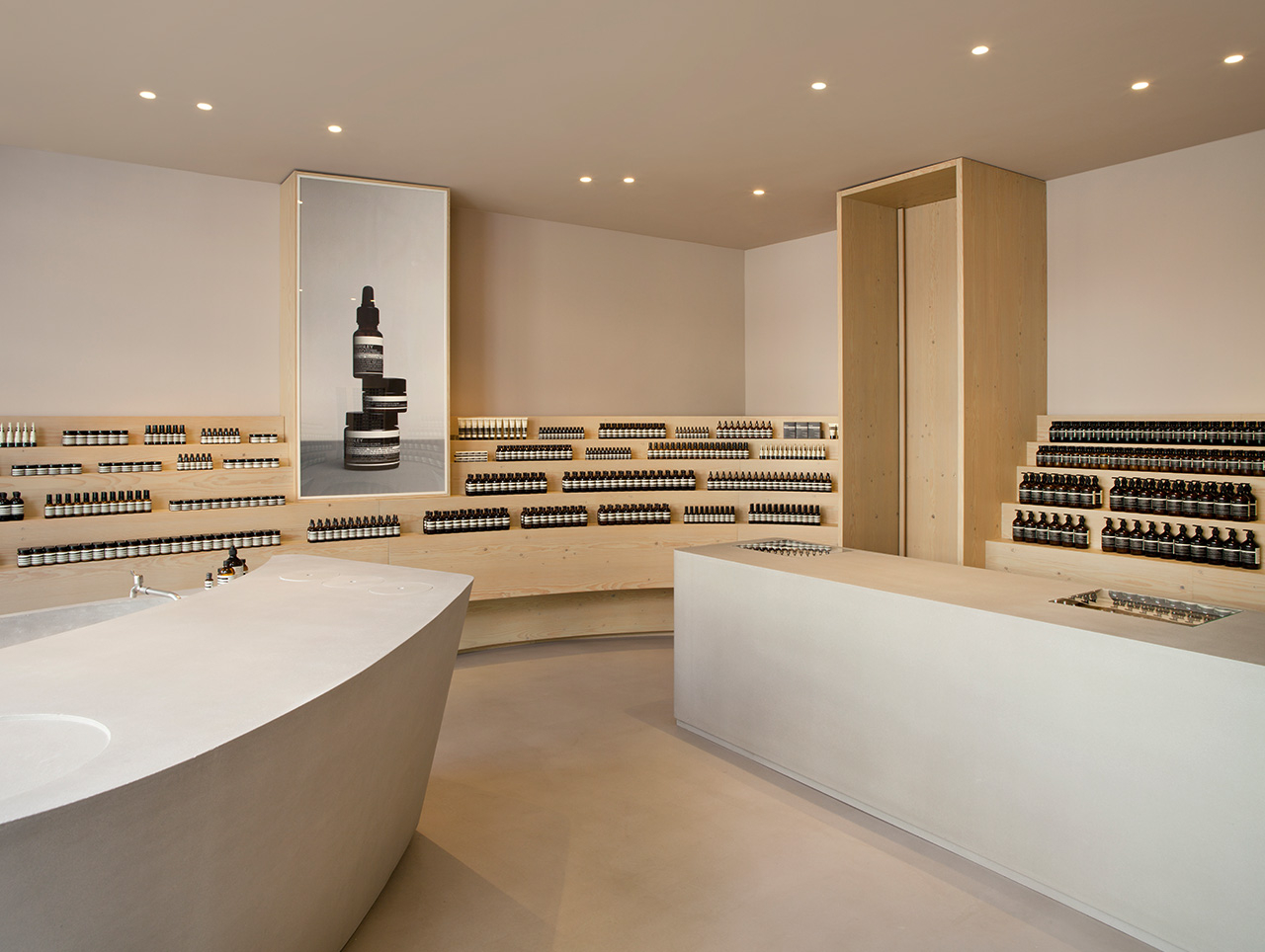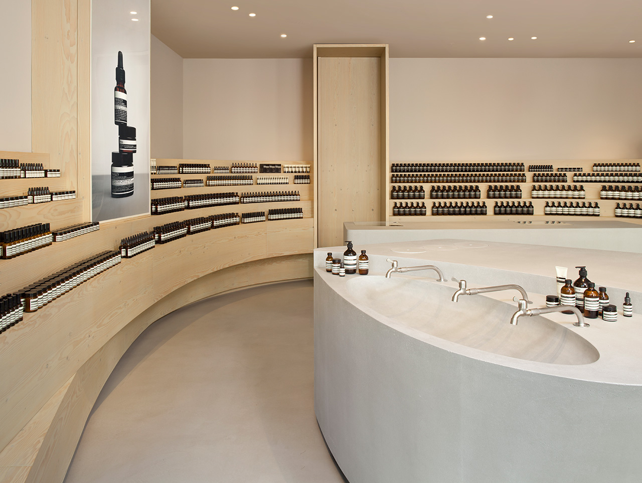 Designed to be an implicit extension of the plaza where the store is located, which is often host to a variety of markets and fairs, the minimal design of the retail space successfully highlights Aesop’s products.