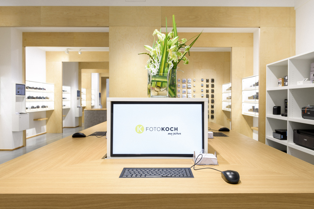 Customers can use touchscreens to receive information about the products from Foto Koch’s website.