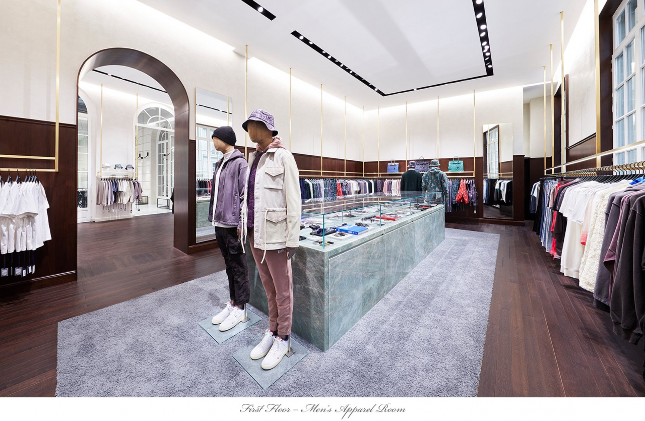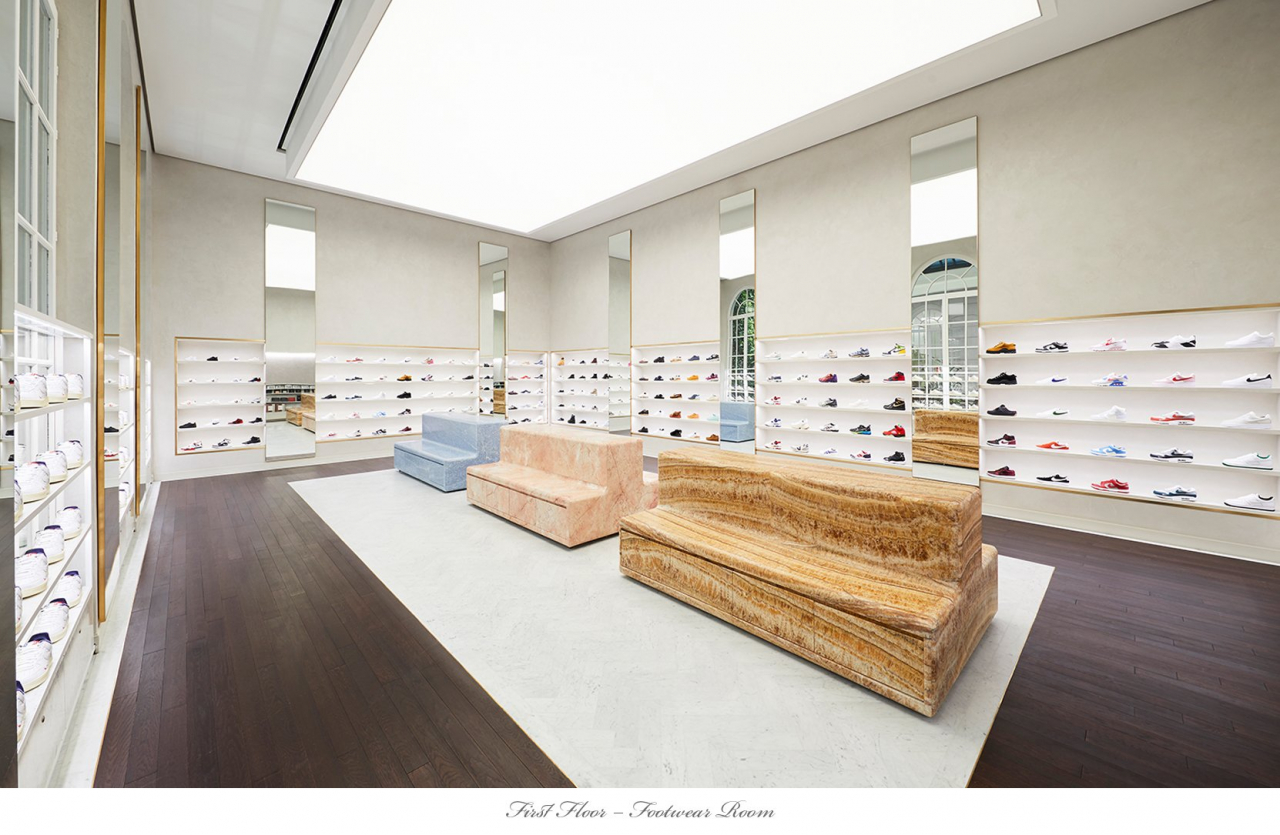 The space features marble floors and stairs, high ceilings, sparkling gold gilding and an ultra-realistic aircraft cabin, not to mention a chandelier designed by Air Max. Take a sneak peek at Kith Paris in the photos below.