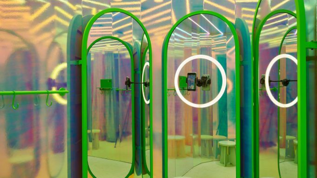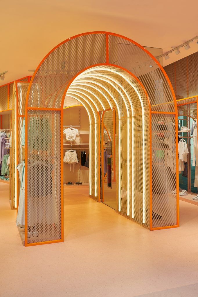 At the entry of the store is a backlit tunnel that displaces the visitor, and eventually each space evolves to form a specific function like the swimming pool which is conceived to be an exhibition element, the hotel reception that will be a place to pay and pick up shopping goods, whereas the washing machine will help you to recycle old clothes. The fitting rooms inside incorporates a metaverse world with optical effects that manipulate reality.