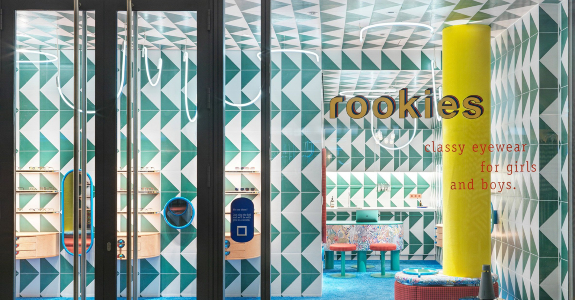 Triangular patterned tiles and an eyewear-dispensing machine feature in Stephanie Thatenhorst's play...