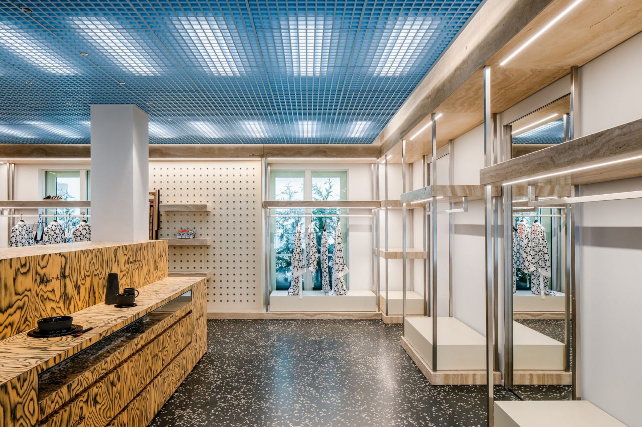 The store’s multifaceted identity is further reinforced by the design of the upper floors. In the intimate atmosphere of the mezzanine, with its low ceiling and small windows, a space inspired by the aesthetics of the gift shop hosts the kids’ and homeware collections, as well as an exhibition wall. On the second floor, for the men’s collection, the high ceiling and large windows facing the city create a luminous, clear space, which can be easily reconfigured for concerts, art shows, and parties. A foldable box finished with Sottsass-red veneer conceals the bar and the back of the house.