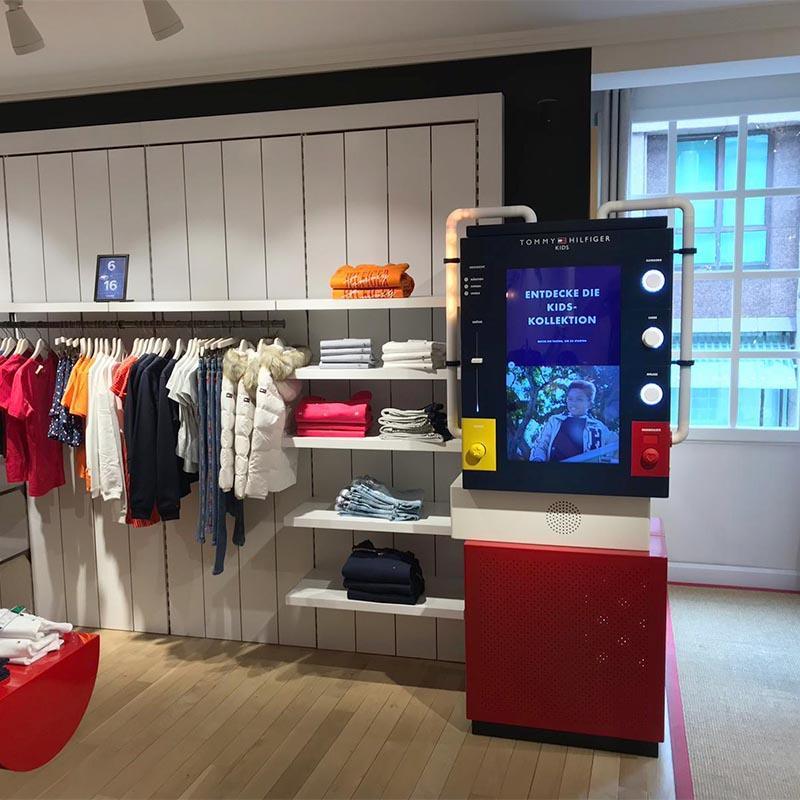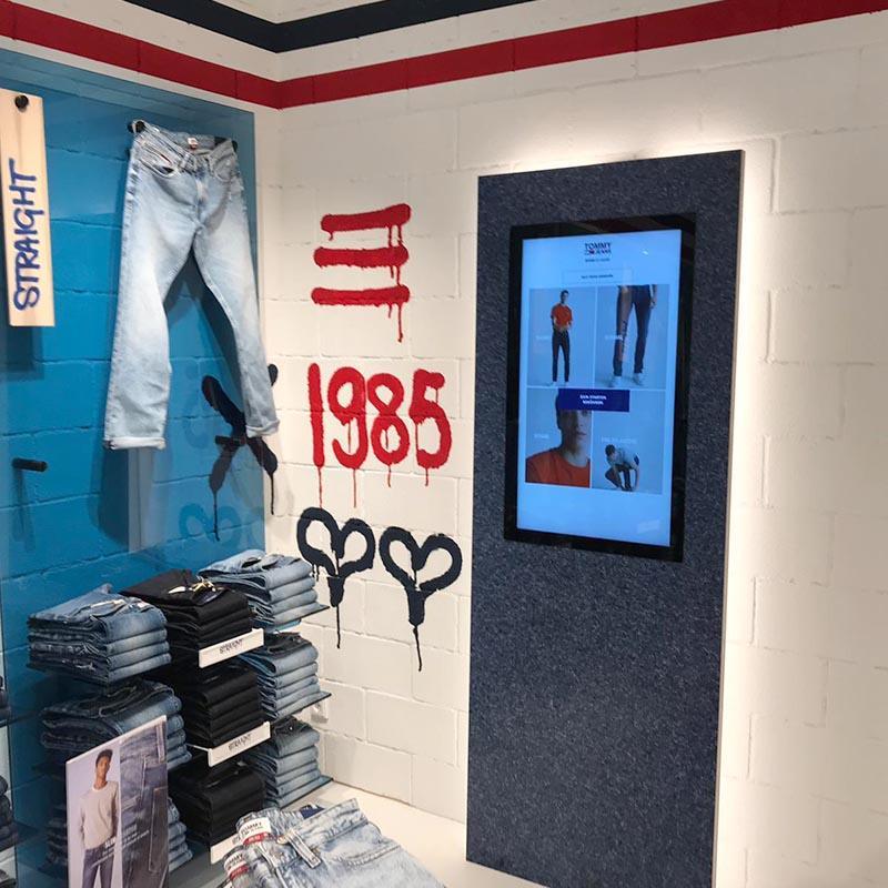 Tommy Hilfiger can be found in a modern and friendly 320-sqm store. A range of digital touchpoints connect the brick-and-mortar store with the fashion retailer’s online shop, which customers can access via large touchscreens. To help customers choose the right fit, videos show what trousers look like while being worn.