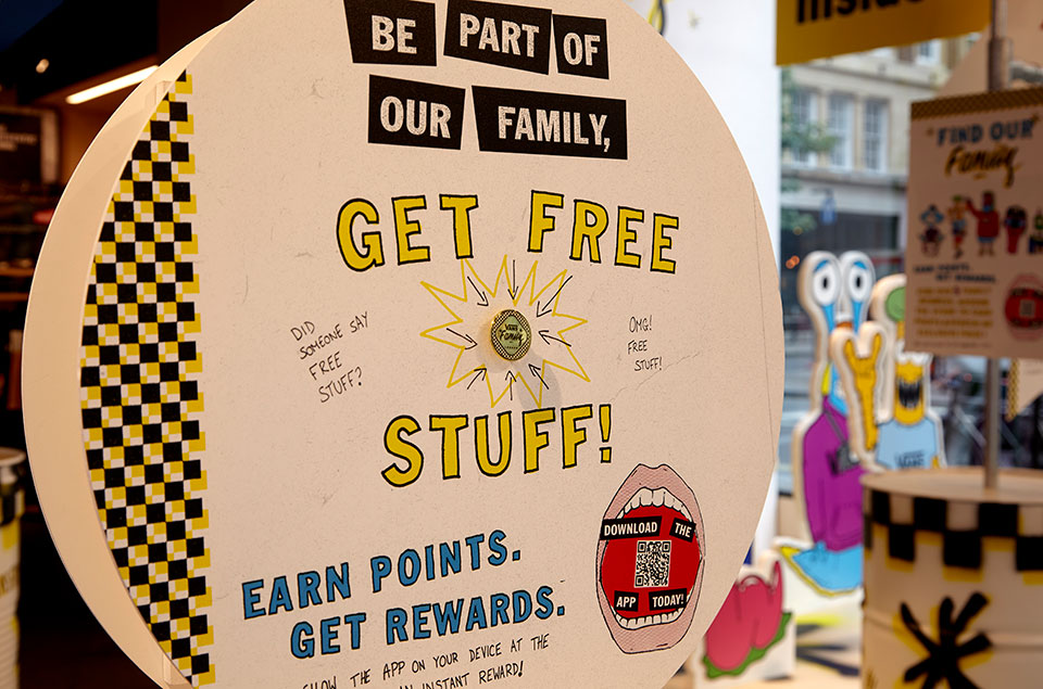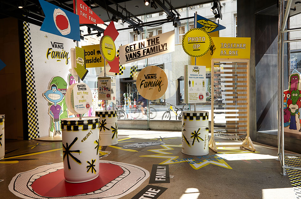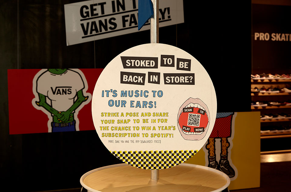 - Driving Traffic into Store: To encourage people to venture beyond the immersive activation, which took over the decompression area at the front of the store, the campaign flowed into the shop floor with graphics, festival bunting and an interactive treasure hunt comprised of hidden VANS family characters complete with QR codes that unlock exclusive content, features and loyalty points within the app.