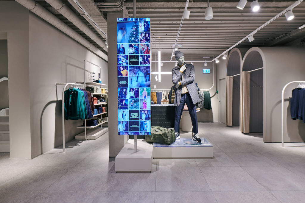 You no longer have to queue at the checkout in this store, but you can easily pay at the service points that are spread throughout the store. In addition, there is an in-store pick-up point for online orders, and next day delivery for WE is ME members. Accessories are also digitally exhibited that can be ordered directly by scanning the QR code. There are also forty large digital screens scattered throughout the store, including social media feeds.
