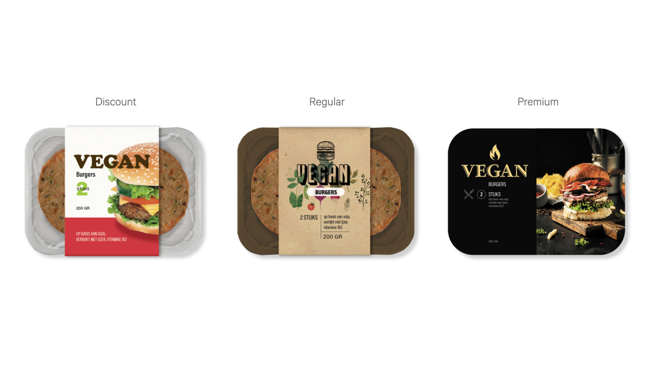 Gezien de discount verpakking in het onderzoek het meeste lijkt op de huismerk supermarkt verpakkingen (zie afbeeldingen onder), is de kans groot dat de vegetarische burger in de buurtsupers te hoog geprijsd is. De resultaten van het exploratieve onderzoek geven aan dat een daling van 38 cent de winst met 30% kan doen stijgen.