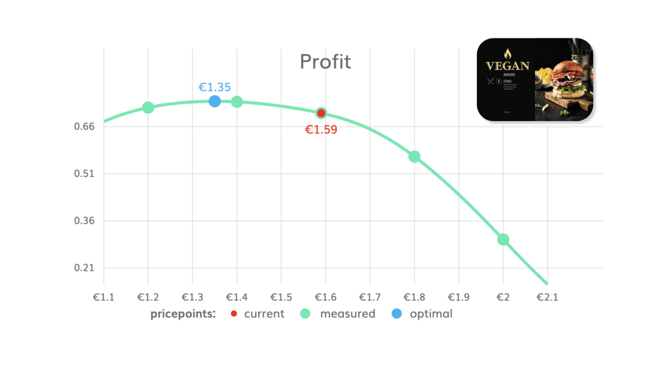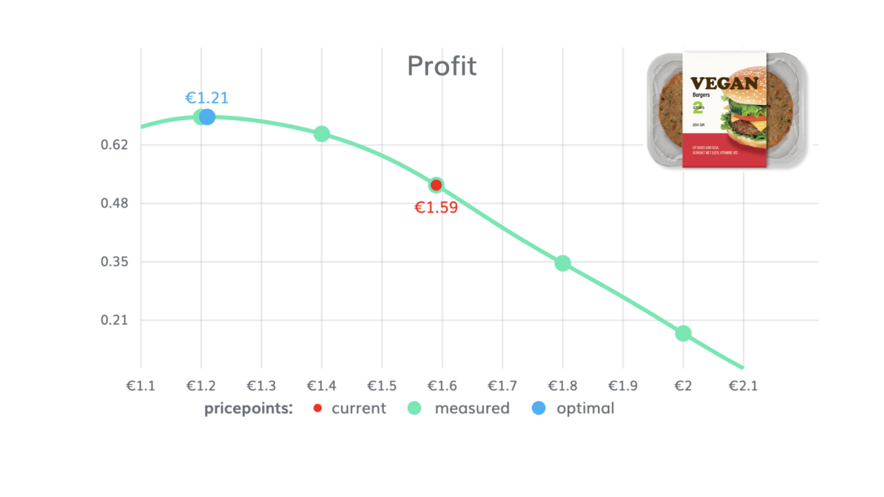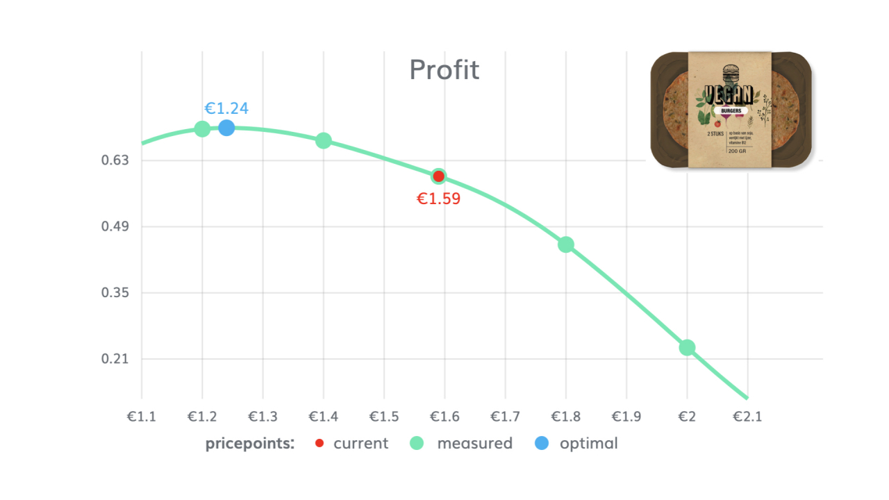 De huidige prijs voor vegetarisch burgers van de huismerken van Albert Heijn & Jumbo is €1,59. De verwachting was dat dit dan een goede prijs zou moeten zijn. De onderzoeksresultaten lieten echter een andere uitkomst zien: de maximale winst werd voor twee van de drie verpakkingen bij een lagere prijs behaald. Voor de discount verpakking wordt de maximale winst al op €1,21 behaald, voor de reguliere verpakking op €1,24.